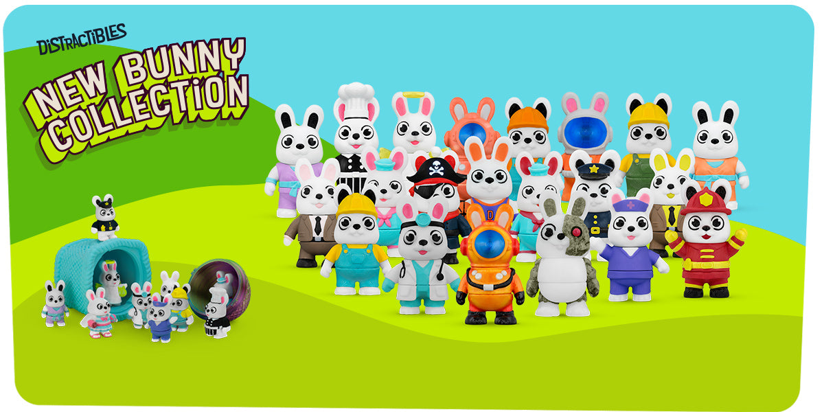 Distractibles Easter Mystery Basket, 8 Articulated Bunny Figures with Basket Container, Random Figures and Mystery Removeable Easter Egg Lid